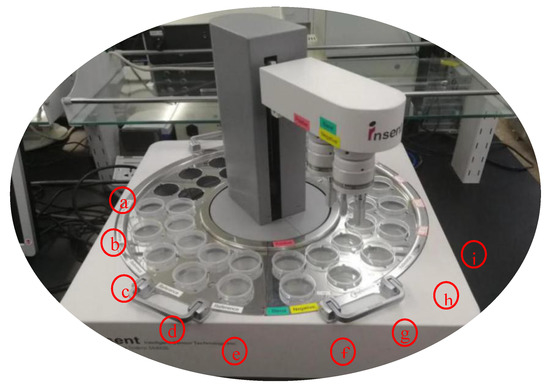The SA-402B e-tongue system (a is used to measure the aftertaste value, b–c is used to quickly clean the sample, d–e is used to clean the positive and negative solution, f is the positive and negative cleaning solution, g is applied for sensor calibration, h is used for sensor reset, and i is liquor sample).