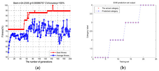 Classification process for liquor taste information with GA-SVM: (a) The parameter optimization fitness curve. (b) The classification result.