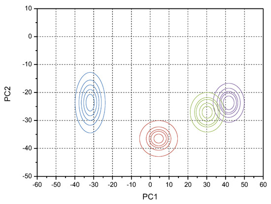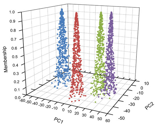 In Figure 3, PC1 and PC2 are the two-dimensional coordinates of the liquor information model, respectively, and the vertical axis is the membership degree of cloud droplet, which represents the certainty of the liquor flavor. The plane consisted of PC1 and PC2, representing the overall taste information of each fragrant liquor. In Figure 3, red represents the jiang-flavor liquor cloud droplets, blue represents the feng-flavor liquor cloud droplets, green represents the nong-flavor liquor cloud droplets, and purple represents the mild-flavor style liquor cloud droplets. The cloud droplets of each liquor were consistent with the characteristics of peak and fat tail. Among the four different flavor types of liquor, only the cloud droplets of jiang-flavor liquor and nong-flavor liquor were partially overlapped, indicating that their taste information had certain similarities. The cloud drop result for feng-flavor liquor was far away from other fragrant liquors, therefore, it can be clearly distinguished from other fragrant liquors in terms of taste.