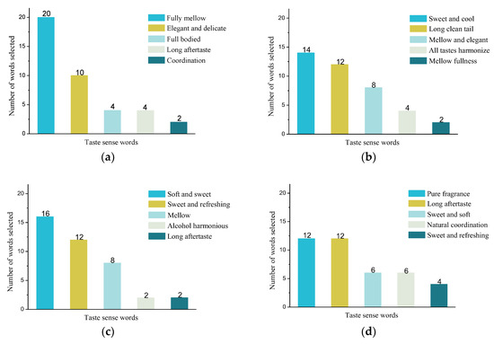 The proportion of liquor taste words selected by examiners: (a) jiang-flavor style, (b) feng-flavor style, (c) nong-flavor style, and (d) mild-flavor style.