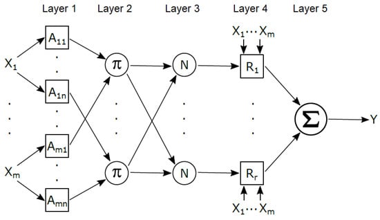 Figure 5 shows the ANFIS network architecture that consists of five layers. Each of m inputs (X) is assigned with n fuzzy membership functions described with linguistic labels (A), constituting r rules (R). Each node in the first layer is adaptive and specifies the degree to which a given input satisfies the fuzzy membership function related with that node. The first layer is called the “fuzzification” layer, while parameters in this layer are called premise parameters. In the second layer a firing strength for each rule is determined. Every node in this layer is fixed and labeled , while the node performs multiplication of the incoming signals. Every node in the third layer is fixed and normalizes the firing strengths of the previous layer. The fourth layer is called the “defuzzification” layer. This layer consists of adaptive nodes and it involves computing the weighted consequent value for each given rule. Parameters in this layer are called consequent parameters. The node in the last layer performs summation of all incoming signals.