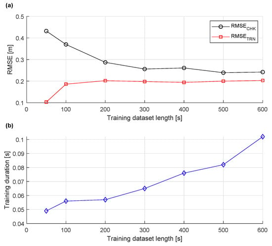 The amount of data used for online training should be taken into consideration as well since a larger training dataset increases the ANFIS training duration. The effect of training dataset length on ANFIS training cycle duration, training , and checking error is shown in Figure 6. Multiple experiments have been conducted with the training dataset increased from 50 to 600 s. As shown in Figure 6a, for 50 s of the training data, is relatively low while is high, which is a sign of network overfitting the training data, and should be avoided. The overfitting is caused by small amount of training data points compared to number of ANFIS modifiable parameters. Up to 200 s of training dataset, most of the is reduced. After that point, training duration grows with little improvement in as shown in Figure 6b.