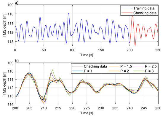 The performance of the ANFIS network is further investigated. As mentioned previously, the sea conditions continuously change, thus the performance of the network trained on one set of the data degrades with changes in TMS heave frequency and/or amplitude. Figure 9a shows the TMS depth recorded over a 900 s period using the depth sensor sampling frequency Hz. Three ANFIS networks, composing of the same structure (, , ), are trained to predict the TMS depth 2.5 s in future ().