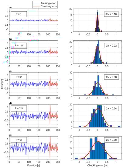 The relationship between the number of training points D and the number of epochs, , and duration of the training process, is shown in Table 4. The data in the table is divided in two major columns by the number of epochs used for training. The left column provides results after only one epoch of training, whereas the right column shows RMS errors and training duration at the epoch with minimum . As shown in the table, both the training and the checking error decreased until . For , the training error keeps decreasing, while the checking error grows. In addition, the difference between the two grows significantly at , which is the sign of network overfitting and must be avoided. Although in general the network performed better after more than 1 epoch, the difference in is not significant. For example, at , after one epoch the checking error is m, and the minimum error is achieved at epoch 63 with m. The difference between the two is negligible, whereas the duration of the training extended ten times from 0.053 s to 0.53 s. The number of membership functions is as the increase in leads to exponential growth of fuzzy rules, thus the training time grows exponentially. In addition, no reduction in has been achieved.