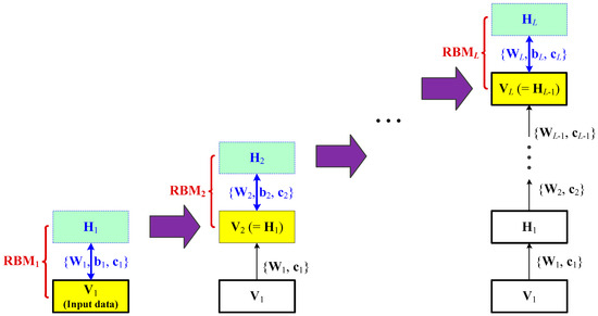 A brief construction of the main DBN structure with multiple layers is shown in Figure 1. With L individual restricted Boltzmann machine (RBM) modules represented as , DBN can extract nonlinear features of the input data hierarchically in the unsupervised learning stage [22]. Each RBM module has a visible layer, V, related to the input data and a hidden layer, H, denoting the outputs, respectively. and are both vectors with binary values (one or zero). Utilizing the input data as the first visible layer , the first RBM module (i.e., RBM1) is trained using the parameters to obtain . With a built RBM1, let , and RBM2 can be trained similarly. Sequentially, the RBMl module with and is trained and finally a series of RBMs are obtained [22].