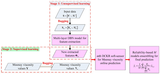 The main modeling flowchart of EDCKR is shown in Figure 2. Notice that all input data (i.e., those online measured secondary variables during the process) are utilized. Compared with current soft sensors for the Mooney viscosity, the EDCKR model extracts more intrinsic features using DBN and it is relatively insensitive to outliers in the modeling stage. Moreover, it is expected that, resorting to ensemble strategies, more reliable predictions can be obtained.