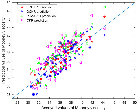 Assayed values and their prediction results of the Mooney viscosity using EDCKR, deep correntropy kernel regression (DCKR), principal component analysis and correntropy kernel regression (PCA-CKR), and correntropy kernel regression (CKR) models.