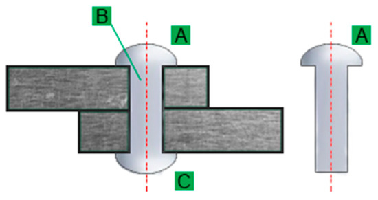 A rivet cross section: (A) head, (B) shank and (C) tail.