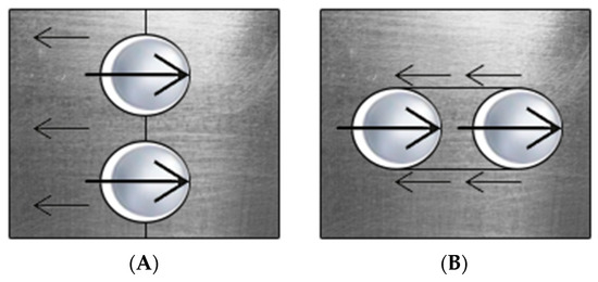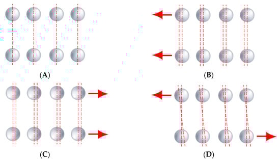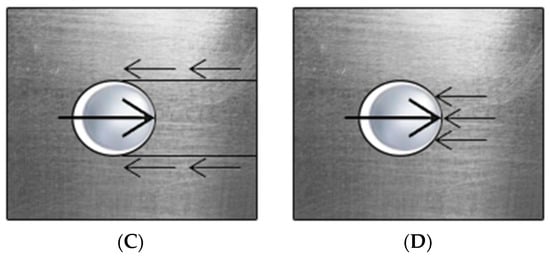 Modes of failure associated with pressure of the rivet on metal sheet: (A) cutting metal sheets between holes in the direction of load, (B) cutting metal sheets between the hole and the edge of the metal sheet in the load direction, (C) tearing the metal sheets in a direction perpendicular to the effort axis, and (D) reaching bearing capacity due to the pressure of the rivet mandrel to the hole.