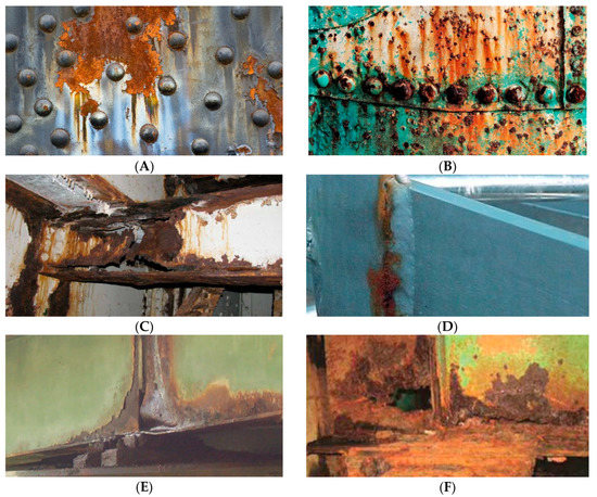 Visual markers indicate the poor condition of the structure: (A) visible corrosion of steel around the rivets, (B) visible corrosion of rivets, (C) visible defects in the material due to corrosion in joint, (D) visible corrosion of the weld and (E,F) visible defects at the supports due to corrosion [24,25].