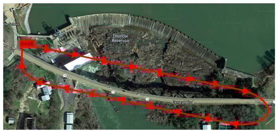 Recently, in search of financial savings as well as human resources, local Departments of Transportation in the United States began to consider using drones to perform bridge inspections [26]. The American Association of State Highway and Transportation Officials March 2016 survey found that 17 state Departments of Transportation had studied or used drones, whereas 16 states were either exploring UAV usage, assisting in the development of drone policies, or supporting drone research [27,28,29]. UAVs themselves cannot perform inspections independently, but can be used as a tool for bridge inspectors to view and assess bridge element conditions following the National Bridge Inspection Standard [30,31,32]. We believe that to achieve profits resulting from the automation of the image analysis process, it is also essential to automate the process of data acquisition, which is the drone flight route. We recommend programming the drone to perform a predetermined path around the bridge, which, in the case of a large number of bridge objects, will allow for significant automation of work and potentially can bring considerable savings [33]. Figure 7 presents an example drone flight route for the case of the bridge we are considering in this study.