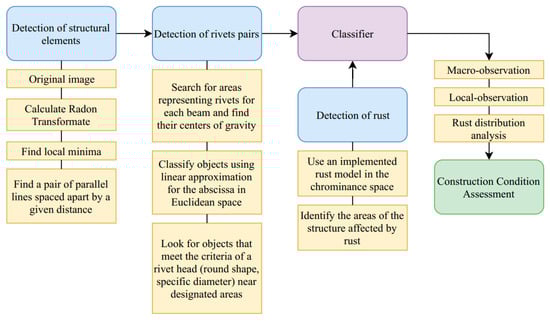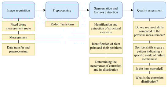 The UAV flight route should not run above the road, so that in the event of a breakdown, it does not fall onto the road surface and cause an accident. The drone route should also be straight that, on the one hand, it will reduce the energy consumption of the equipment and, to some extent, prevent the device from rocking, which would negatively affect the collected material [34,35,36]. A unique way to plan a drone flight route was presented by Sunghun Jung [37], in which he showed an algorithm that provides a flight path with low electricity consumption. Ultimately, to limit any human interference, we recommend installing a permanent UAV nest near the bridge, from which the drone would take off and in which it could recharge a battery. We believe that such an installation for constant monitoring could be an element determining the reliability of the structure. Correct data acquisition is a crucial aspect of the entire monitoring process [38]. The requirements that are set during image acquisition are closely related to the needs that define the accuracy of the measured changes. This means that during image acquisition, there are several important issues, such as appropriate selection of the camera focal length-blurred image makes it difficult to perform correct estimates by the proposed method [39], appropriate close-ups of details the accuracy of measurements are directly proportional to the number of image points (pixels) representing one millimetre of the real object (accuracy of 1 mm/number of pixels) [40], orthogonality of the optical axis to the tested object and elimination of external factors such as atmospheric conditions, snow, rain, or sun that cause glare or shadow. The study on visual markers and modes of failure prompted us to conclude possible solutions, which allow as identifying the deteriorating condition of the structure efficiently. We decided to focus on detecting rivets and their position, as well as determining the level of corrosion and its distribution. The bridge we analyse is a steel truss bridge. The first step our algorithm will perform is identifying and separating steel beams. Next, we will classify and extract the position of the rivets. In our view, by comparing the images in time, we will be able to determine if the position of the rivets has shifted relative to the previous measurement, and also what is the nature of this shift. Next, we will identify corroded places and determine their size. In Figure 8, we present a proposed multidetector system for monitoring steel-braced bridges. The entire monitoring process consists of four main stages, namely image acquisition, preprocessing, segmentation, features extraction, and quality assessment. Our unique contribution lies in merging computer science with structural engineering knowledge, to create a solution tailored for needs of structural health monitoring of steel bridges.