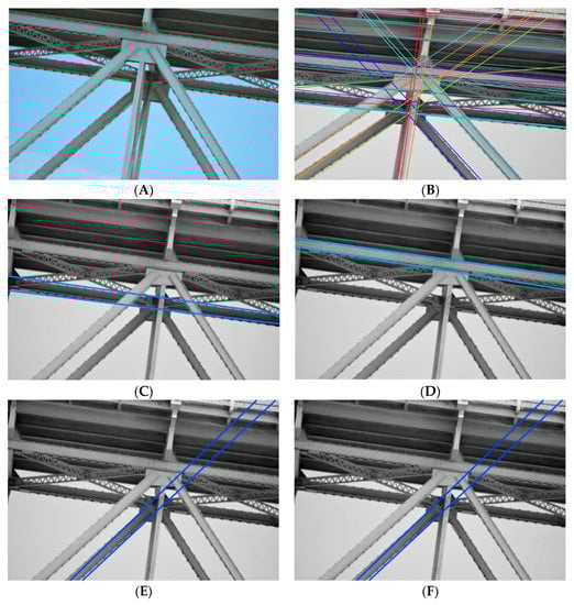 (A) Original image. (B) Preliminary beam identification. (C–E) Correct beam detection. (F) Incorrect beam detection.