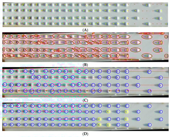 Rivet detection: (A,B) Search for areas representing rivets for each beam and find their centres of gravity. (C) Classify objects using linear approximation for the abscissa in Euclidean space. (D) Look for objects that meet the criteria of a rivet head (round shape, specific diameter) near the designated straight lines.
