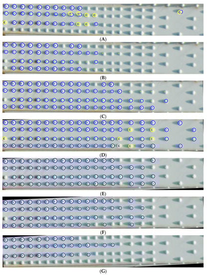 Rivet detection in relation to rotation angle of the image: (A) θ = −1.5°, (B) θ = −1.0°, (C) θ = −0.5°, (D) θ = 0.0°, (E) θ = 0.5°; (F) θ = 1.0°; (G) θ = 1.5°.