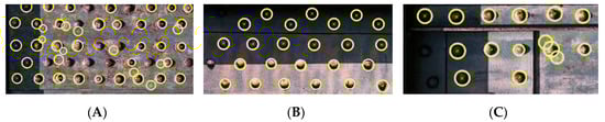 Clippings from sample results of the additional analysis: (A) The most unfavourable test result—size 295 × 158, correctly detected rivets 80%, incorrectly detected rivets 20% and undetected rivets 37%; (B) Size 320 × 135, correctly detected rivets 96.6%, incorrectly detected rivets 3.3% and undetected rivets 0%; (C) Size 395 × 95, correctly detected rivets 88.5%,, incorrectly detected rivets 11.5% and undetected rivets 26.9%.