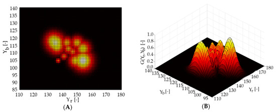 Afterwards, we estimate areas of the monitored object affected by visible corrosion. The criterion is a colour represented in YCbCr space [44,45]. Simple colour thresholding may prove to be ineffective. Therefore, we propose to adapt the model usually used for skin detection [46]. To carry out this, we built a rust base, a histogram of information about the colour in the form of two chrominances . Then, we approximate histogram maxima by the two-dimensional Gauss function, as in Equation (5).
