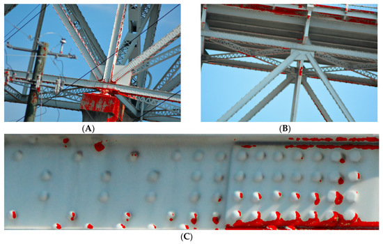 Rust detection: (A,B) close-up to nodes and (C) close-up to rivets.