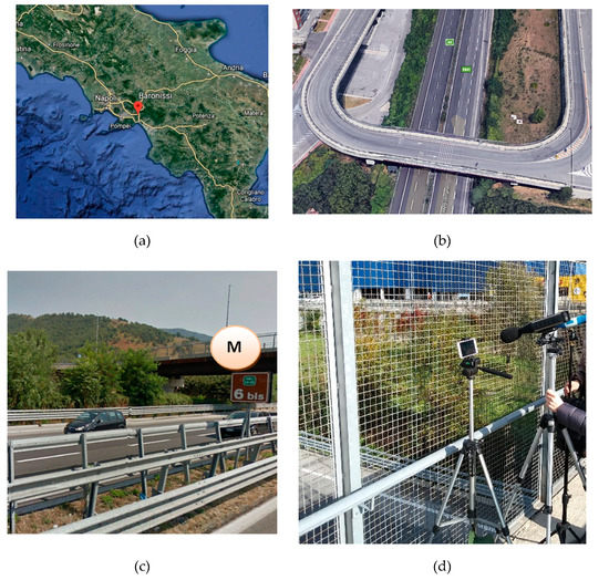 A preliminary application of the EAgLE methodology has been performed on a site located along the Italian highway A2 “Autostrada del Mediterraneo”. This highway is managed by ANAS S.p.a. and goes from the crossing between A30 and RA2, in Fisciano, to Reggio Calabria. The video recording and the measurements have been performed in the city of Baronissi (Figure 2a), in the segment between Fisciano and Salerno, from the sidewalk of a bridge (Figure 2b,c), in safety conditions (Figure 2d). In this segment, the highway is made of two lanes per direction, with an entering lane coming from a gas station, in the south-north direction. Anyway, the entering flow recorded during the measurements was negligible. Furthermore, the traffic on the bridge was negligible. No unusual events have been recorded, such as noisy motorcycles, airplanes passing by, honking, etc., meaning that the conditions of test are quite ideal for the application of the methodology.