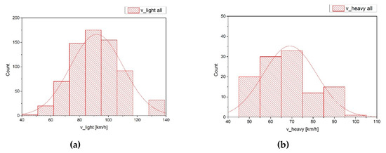 Speeds distributions for light (a) and heavy vehicles (b) summing the speeds estimated in both the video cuts.