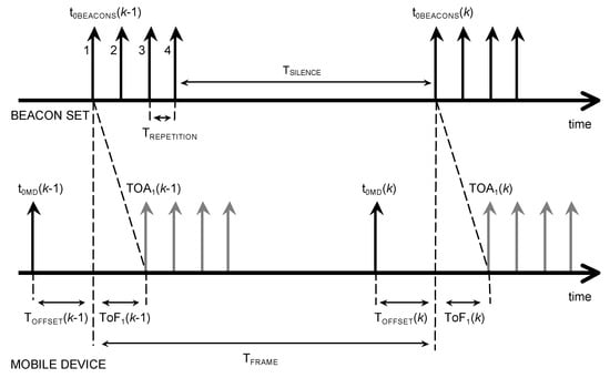 Therefore, two distinct periodic processes can be considered: (1) The ultrasonic emission frame repetition which starts at t0BEACONS; (2) the listening window which starts at t0MD (see Figure 2). They are repeated with equal periods but with different starting times. There is, therefore, a lag or time offset between the two processes TOFFSET = t0BEACONS- t0MD that is unknown.