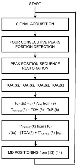 A block diagram of the proposed positioning algorithm, as executed onboard the MD, is shown in Figure 3.