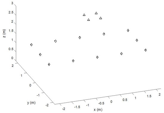 where l1, l2,…l4 are the distances between the MD and the four beacons. In what follows, it is assumed that, as usual, in a room the air flows and temperature gradient are kept under control for reasons of well-being of the occupants of the room. Residual fluctuations have very small effects on positioning accuracy. Alternatively, methods based on direct or indirect measurement of the speed of sound along the propagation path (see e.g., []) can be adopted.