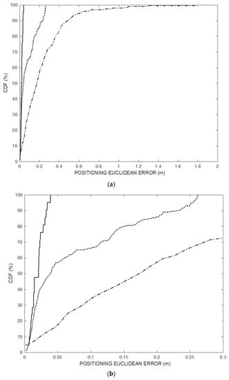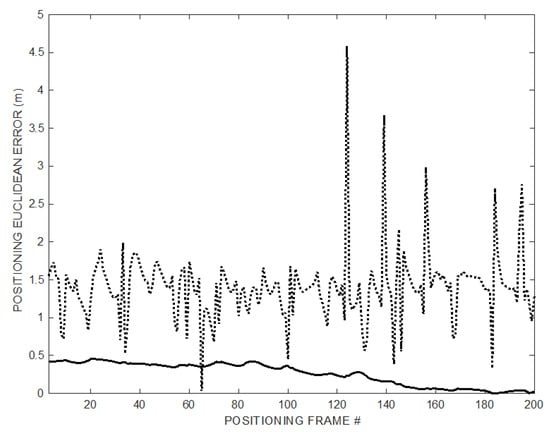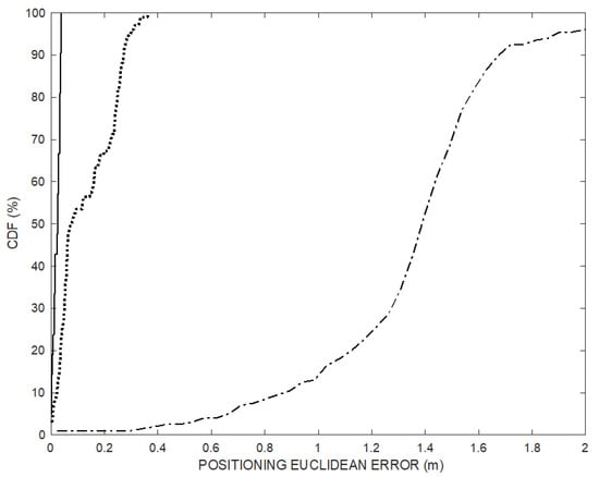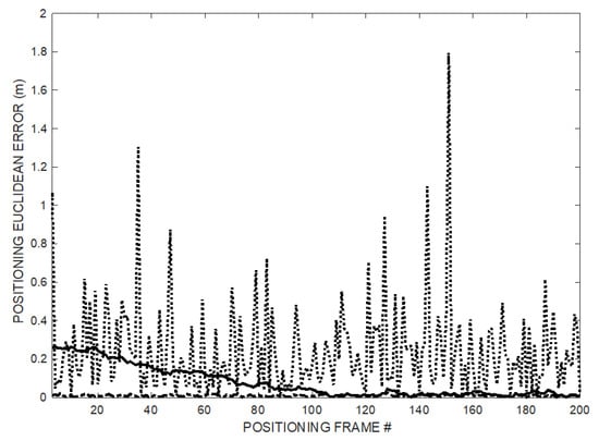 Figure 13 shows the cumulative error distribution (CDF) of the experimental positioning data set of Figure 11 over the 200 positioning frames (dotted line) and of the last 20 trajectory points (solid line) after convergence transient, compared to CDF of the TDOA technique (dash-dot line). The positioning Euclidian error of the last 20 points obtained by the proposed method after convergence is below 5 cm.