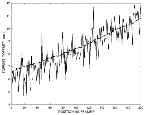 If TOFFSET were really constant, in order to obtain an accurate estimate of the TOFFSET, it would be enough to make an average of the noisy values of the rough TOFFSET estimates coming from (9), provided that the noise has zero mean value. This is in fact the approach followed by [], which used a moving average. In practice, however, this approach does not work well.