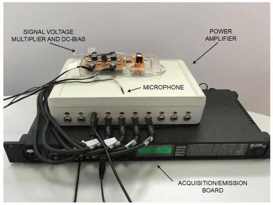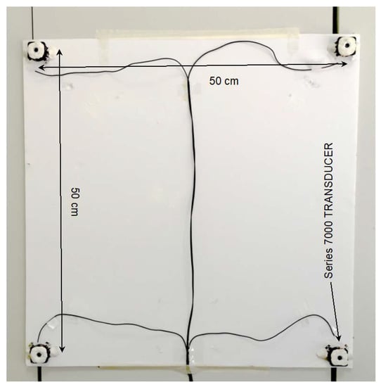 The Beacon Set Unit components are mounted on a square 52 × 52 cm2 panel. The four transducers are placed at the corners of a 50 × 50 cm2 square, face up toward the room volume (see Figure 9).