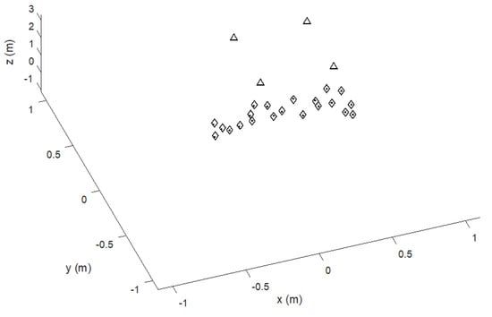Knowing the distances between MD and reference points (at least three for 3D positioning in a hemispace) allows finding the position of the MD as the intersection of spheres centered at the reference points, which implies the solution of a set of nonlinear equations. There are many approaches to solving these nonlinear equations: Direct geometric solution, minimization of a suitable cost function, or statistical methods (Bayesan methods, Kalman filtering) []. Geometric methods are based on the linearization of the system of equations in order to find a mathematically closed form solution [,]. When it is allowed to appropriately choose the number and arrangement of the emitters, the system of nonlinear equations can be solved directly []. The main problem with these methods is noise sensitivity in some positioning areas.