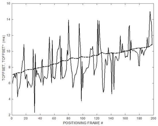 On the contrary, in this work, the ramp follower is applied to the parameter TOFFSET which varies very slowly, obtaining the T*OFFSET. It is worth noting that (10) converges recovering the synchronization without having any prior information on the TOFFSET and starting from the first value provided by (9). It is also possible to observe that Equations (9)–(10) do not introduce any constraint on the trajectory of the measured MD positions to estimate l1 and T*OFFSET. In fact, (10) converges regardless of the trajectory followed by the MD.