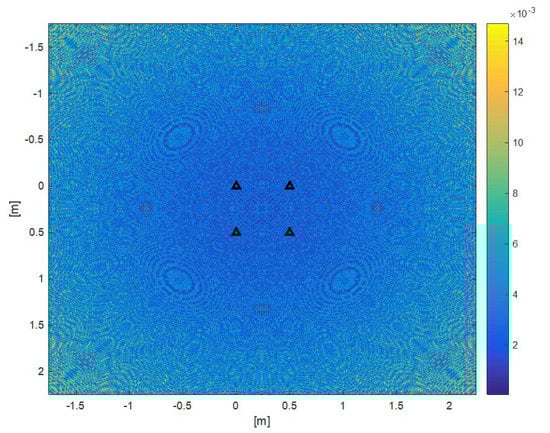 Simulation quantization error computed in a grid of points of plane z = 1.5 m, and by considering in sequence a = b = 0.5 m. The maximum error magnitude is 14.7 mm. Same error shape with a = b = 1.5 and 0.25 m, but with maximum error about 5.1 and 32.0 mm, respectively. Triangles show beacon positions. The error magnitude is of the same order but less than the value provided by (17), which is in fact the upper bound of the real error. The quadrangular symmetry of the Beacon Set produces an error shape with the same symmetry without blind or poor accuracy points.