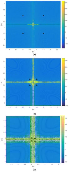 Estimation error of l1 from (9) due to the quantization error on the estimates of d1, d2, and d3 computed in a grid of points of z = 1.5 m, with different beacon set sizes: a) a = b = 1.5 m, b) a = b = 0.5 m, c) a = b = 0.25 m. Triangles show beacon positions. The error magnitude is in decibels (dB). Larger Beacon Sets considerably reduce the size of the “bad” region.