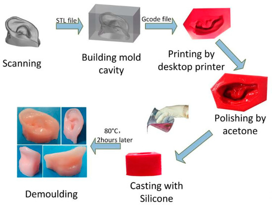Representation of the individual steps of the molding and demolding processes to form soft tissue prostheses [57]. Reproduced from He, Y.; Xue, G.H.; Fu, J.Z. Fabrication of low cost soft tissue prostheses with the desktop 3D printer. Sci. Rep. 2014, 4, 6973.