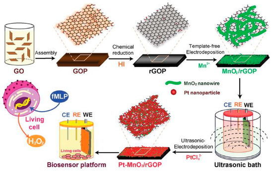 Russo et al. [58] introduced a soft and stretchable silicon-based sensor that can be stretched to deform the cross-section for measuring the change in electrical resistance. A biocompatible NaCl solution-filled channel and gold stretchable electrodes were integrated with this silicon rubber. This electrode-based sensor can be used in medical applications by measuring the applied strain during large deformations. The silicon rubber-based 3D printed mold was kept for four hours at room temperature and then cured. One of the interesting works [59] is associated with the fabrication of metal–metal oxide nanostructures on freestanding graphene that have the potential to be employed for bio-sensing, bioelectronics, and lab-on-a-chip devices. Figure 6 [59] shows the schematic diagram of the fabrication process of the paper-based biosensing platform. High-density platinum nanoparticles were deposited on freestanding reduced graphene oxide paper that carried MnO2 networks. The fabrication of the graphene paper was done via evaporation and chemical reduction of an aqueous dispersion of exfoliated graphene oxide nano-sheets that are cast on printed molds. The template-free electrodeposition of MnO2 nanowire networks was done on the reduced graphene oxide substrates to induce a larger surface area via 3D systems. Graphene oxide was synthesized using modified Hummer’s method and formed an aqueous solution to cast on polytetrafluoroethylene-based mold. The thickness of the graphene oxide paper was varied between 1 to 30 microns by varying the volumes of graphene oxide dispersion. The graphene oxide solutions were then reduced by immersing them in an Hydrogen Iodide (HI) solution at room temperature for an hour. The reduced graphene oxide was then thoroughly washed with deionized water and dried at room temperature for 10 h. The electrodeposition and ultra-sonication of platinum nanoparticles done on the MnO2 network-coated graphene paper were based on the controlled size and morphologies of platinum nanoparticles that were fabricated using wet-chemical and electrochemical approaches. Cyclic voltammetry was done on the reduced graphene oxide electrodes after immersing them into NaSO4 and MnSO4. The obtained papers were then used for potentiostat deposition of platinum nanoparticles via ultrasonic irradiation. The samples were then again washed, dried, and stored in the vacuum desiccator. The effect of the proper size distribution of the nanoparticles achieved good versatility in catalytic and sensing processes. The advantage of this approach was related to avoiding size limitations, which increased the flexibility of scaling-up of the sizes in different applications.