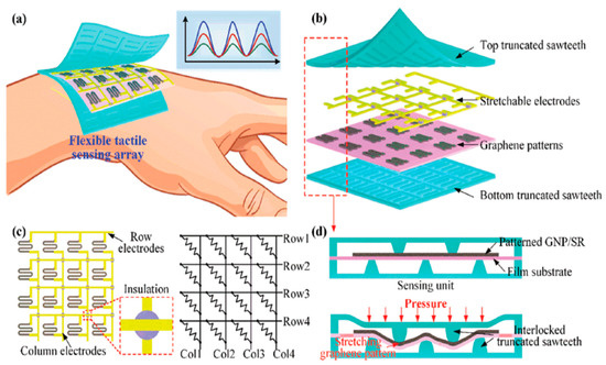 Wang et al. [60] developed a flexible and highly sensitive tactile sensor that can be used in biomonitoring electronic devices and robotic parts. It has an interlocked truncated saw-tooth structure, which converts the external pressure to the tensile strains. The sensor was composed of a layer-based 4 × 4 sensing unit with a resolution of 5 mm and the top and bottom layers were fabricated by mold casting. Liquid Silicon Rubber was used to fabricate the layers by pouring it into the plastic mold and heat was applied to cure the Silicone Rubber (SR). Due to this SR, the top and bottom layer and graphene layer exhibit high flexibility. Also, the flexible printed circuit was made by row and column electrodes. Figure 7 [60] shows the overview of the different layers of the sensing array, their electrode configuration and the cross-sectional view of the prototype that was used pressure detection.