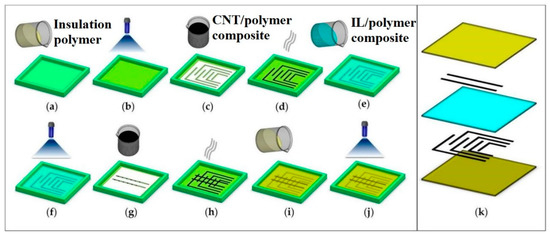 Schematic diagram of the fabrication of piezoresistive sensors using multi-walled carbon nanotubes (MWCNTs)-polymer composites. (a), (b) TangoPlus is poured onto the formed mold and cured to form the insulation layer; (c), (d) The screen printing and thermal curing of the MWCNTs/polymer paste were done to form the first electrode layer; (e), (f) A composite formed by ionic liquid and polymer was poured on the mold and cured to form a piezoresistive intermediate layer; (g), (h) The second layer was then formed by pouring and curing of the MWCNTs/polymer paste; (i), (j) Finally, TangoPlus was poured and subsequently cured onto the samples to form the top insulation layer; (k) Enlarged view of the sensor. Reproduced from Emon, M.; Choi, J.W. Flexible piezoresistive sensors embedded in 3D printed tires. Sensors 2017, 17, 656. Reproduced from Emon, M.; Choi, J.W. Flexible piezoresistive sensors embedded in 3D printed tires. Sensors 2017, 17, 656 [76].