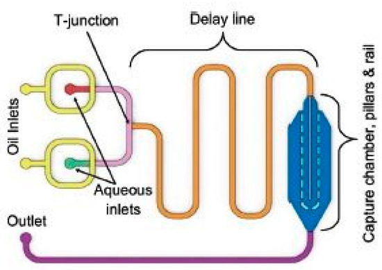 Another work on microcontact printing that used 3D-printed molds can be exemplified on the development of liquid-phase electronic circuits [77]. The elastomeric circuits were built with GaIn alloy via casting and needle injection techniques. A micro-patterned mold was developed using photolithography and cast on with silicone elastomer. The sample was cured and bonded to another elastomeric layer for sealing purposes. The embedded micro-channels inside the layer were then filled with liquid GaIn alloy using a needle and syringe. Finally, wires were externally connected to the terminals of the circuit, followed by sealing them with silicone elastomeric droplets. Park et al. [78] explained the fabrication of hyper-elastic pressure transducers with silicone rubber and liquid eutectic gallium–indium. The sensors were used for measuring pressure ranging between 0 and 100 kPa to determine the changes in resultant resistances. The dimensions of the fabricated microchannels were around 25 microns, developed using the mask-less soft lithographic technique. The soft lithography was done on PDMS after it was cast on SU-8 mold. The elastomer was removed from the mold after forming a hydrophobic monolayer via thermal deposition. The channels on these were formed by bonding the patterned PDMS to un-patterned PDMS using oxygen plasma treatment. Silicone rubber was cast and cured at room temperature for 4 h to form the micro-channels of the sensors. These elastomers were then peeled off and bonded on a thin uncured layer of EcoFlex. Then un-patterned elastomeric layers were spin-coated to form a thin layer on the micro-channels to avoid their exposure. The two elastomeric layers were then cured together to form proper bonding, followed by filling the channels with syringe-assisted GaIn. Finally, the channels were sealed with another layer of EcoFlex. Similar work was shown by King et al. [79] depicting the fabrication of bilayer arrays in milli-fluidic droplet traps formed from 3D printed molds. Figure 13 [79] shows the schematic diagram of the design of the developed chip. The presence of the inner droplet lipid bilayers along with the formation of the droplet arrays are shown in the diagram. The 3D printed molds with a thickness of 2 mm were developed using CAD and subsequently baked at 80 °C overnight to make them suitable for PDMS casting. The baking was done by attached the molds on a glass that was coated with non-polymerized PDMS. Then the molds were covered with a layer of trichloro (1H,1H,2H,2H-perfluorooctyl) silane via exposing them to silane vapor for an hour in desiccated conditions. The sample was then off the glass and punched to form access holes in them. The oxygen plasma treatment was done on the samples after they were again bonded to glass slides to seal the channels. Then, the channels were filled with a mixture of trichloro (1H,1H,2H,2H-perfluorooctyl) silane and ethanol and subsequently washed with ethanol. Finally, the samples were dried with nitrogen gas for 30 min and baked at 80 °C to ease the flow of the aqueous droplets through the channels.