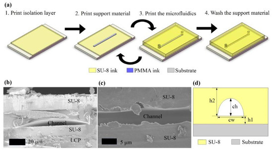 Su et al. [80] used an inkjet printing technique to develop a 3D microfluidic device due to its high fabrication speed and good resolution. Figure 14a [80] shows the schematic diagram of the steps of fabrication using an inkjet technique to form the printed prototypes. The cross-sectional views as shown in Figure 14b,c [80] under different magnifications depict that the prototypes have high aspect ratios. Figure 14d [80] shows the sketch of the cross-sectional view of the prototypes to show its dimensional notions. PMMA was used to support the structure during the curing of the SU-8 ink. The printer can print the grid of 5 × 5 μm pixels which is a very minimal resolution for the pattern. For this microfluidic device, the ink used in this 3D printing process can be easily integrated with electronics which is the advantage of this process. The sensors fabricated by inkjet printing can fabricate low-cost, flexible electronics with a good frequency range. Dijkshoorn et al. [81] used thermoplastic polyurethane, polylactic acid (PLA) and conductive Inks in fused deposition modeling to develop a sensor for capacitive sensing and resistive sensing. The sensor is also capable of magnetic sensing and electrochemical sensing in their future applications. During the strain gauges and piezoresistive sensing, the sensor can be printed which allows conductive traces to be positioned ideally for the expected loading.