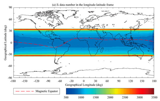 Figure 2 shows the distribution of the global scintillation events for nighttime (i.e., 18-06 LT) within a 2° × 5° spatial resolution longitude-latitude frame observed by the CYGNSS satellites in 2017. Only the S4 greater than 0.2 are counted and the S4 which greater than 2 are removed as outliers. As shown in Figure 2a, the distribution of the S4 data number is generally latitudinally independent within the ±30° region. The temporal resolution is 1 s, and we defined the S4 data number by calculating all the S4 value in the 2 × 2 grid. Due to the satellite orbits, the number of S4 data is larger within the boundary area, i.e., at latitudes greater than 30°. We have considered the effect of the latitudinal dependence of the calculation on the distribution of the global scintillation events derived from the CYGNSS observations. As can be seen in Figure 2b, the scintillation events exhibit an obvious four-peak longitudinal structure. Figure 2b shows that the occurrence of equatorial scintillation events is more prominent than that in low-latitude region.