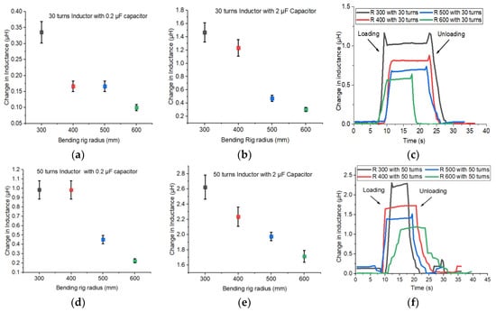 The change in inductance results of 2 µF capacitor are almost the same as the results obtained using the LCR meter. For example, when the fabricated 30 turn inductor is subjected to a bending test with rig radius 300 mm, a change in inductance of 1.5 µH is observed from the fabricated data acquisition system. When the same experiment is repeated with the RLC meter a change in inductance of 1.15 µH is observed. The difference is 23% when comparing the results from the fabricated data acquisition system and RLC meter. Similar change in inductance is also observed for the other bending rig radii. When the 50-turn inductor was subjected to bending test with the 300 mm radii, the fabricated data acquisition system gave a change in inductance of 2.62 µH. When the same test is repeated with the RLC meter as the data acquisition system, the maximum change in inductance observed was 2.27 µH, which is shown in Figure 10f. This shows a difference of 13% when compared to the change in inductance obtained from the fabricated data acquisition system. When the fabricated 70 turn inductor was subjected to the bending test with the fabricated data acquisition system a maximum change in inductance of 3.5 µH was observed for 300 mm radii. When the same experiment had been repeated with an RLC meter the maximum change in inductance observed was 6.2 µH. The percentage difference between both the results is 56%. From this it can be observed as the number of turns in the inductor increases the results show larger deviation between the fabricated data acquisition system and the RLC meter.