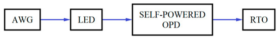 Block diagram of the experimental setup, using an arbitrary waveform generator, a high luminosity light-emitting diode, a self-powered OPD, and a RTO. AWG: Arbitrary waveform generator; RTO: Real-time oscilloscope. LED: Light-emitting diode, OPD: Organic photodetector.