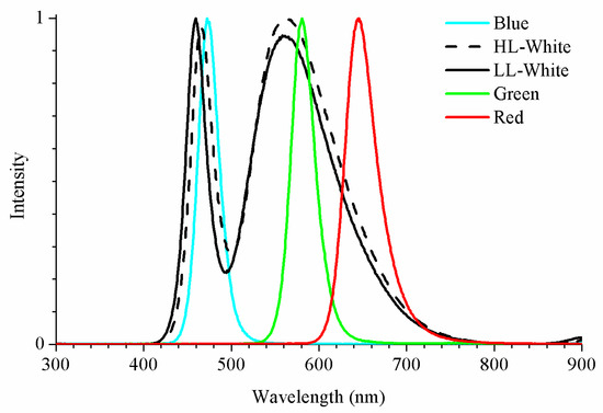 Figure 3 shows the intensity spectra of the LEDs used in our study. It is noteworthy that two types of white LEDs were employed, high- and low-luminosity white LEDs (HL-white and LL-white). In reviewing the spectra, the wavelengths of the maximum emission peaks of LL-White and HL-White presented very close values, namely, 459 and 465 nm for the narrow peak and 559 and 562 nm for the broad peak (Table 1). Besides, the difference between the full width at half maximum (FWHM) of both spectra was negligible, which was 2 and 4 nm, respectively. Therefore, these may be sufficient reasons to affirm that the white LEDs have the same spectral distribution, although their intensities were different, where the HL-White intensity is double that of LL-White. In order to measure the irradiance, a BPW34 photodetector was used as a reference.