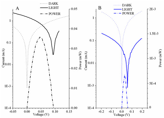 where VMPP and IMPP are the voltage and current of the maximum power point. The efficiency is the relation between the maximum power generated by the solar cell and the incident power radiation. In our study, the power radiation was 0.4 W, due to the collection surface (4 cm2) and the light conditions. The data collection in the measurements (Figure 5) showed that the OPD based on the polymer blend present improvements in all electrical parameters. Although, the fill factor is slightly higher in the OPD based on pristine P3HT. In these kinds of devices, it is not common to use a P3HT polymer as an active layer, because the electrical characteristics have very low values, as Table 3 indicates.