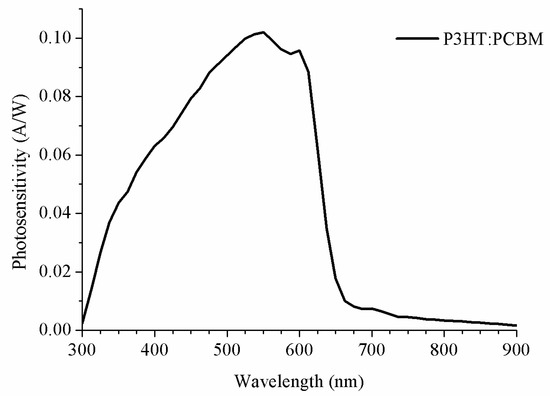 Finally, the photo sensitivity of the OPD has been evaluated from its external quantum efficiency. The calculation of this datum is straightforward, with no more than clearing than the last term on the second half of Equation (3), leading to Equation (8):