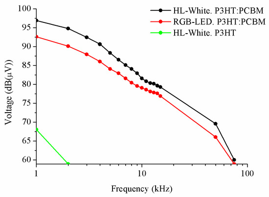 The results of Figure 9 show the maximum supported frequency of the system using P3HT-PCBM and P3HT using different LEDs. In the case of red, green, and blue LEDs, we only show one curve in order to represent the results because the results of three ones are equal. The different bandwidths of the devices may be due to the polymer blend, which has a higher absorption and a higher EQE. In addition, the P3HT:PCBM blend has a greater charge mobility than the P3HT polymer, [18], improving its bandwidth [19].