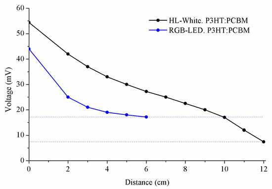 Results of maximum supported distance of the system using P3HT:PCBM and P3HT.