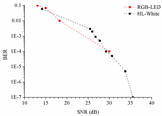 Results of BER versus signal-to-noise ratio (SNR) for the RGB-LED (red) and HL-White LED (black).