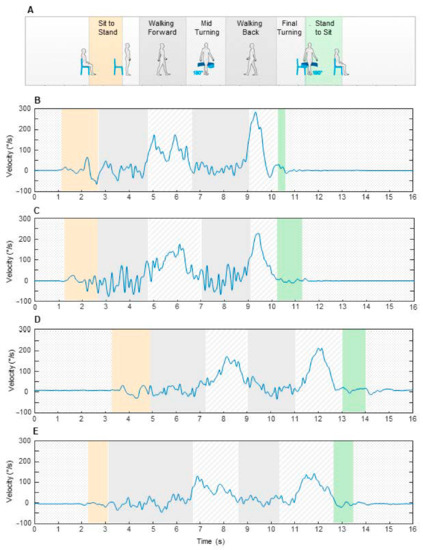Subcomponents of instrumented timed up and go (iTUG) test measured in the experiments (A). The plots represent examples of angular velocity profiles and components duration observed in a child (B), a young adult (C), a senior adult (D), and an elderly person (E). The data are relative to the test performed along 3 m.